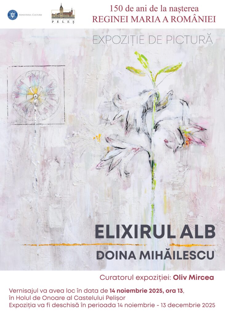Muzeul Național Peleș va deschide vineri, 14 noiembrie 2025, ora 13:00, în Holul de Onoare al Castelului Pelișor, expoziția de pictură ,,Elixirul alb” a artistei Doina MIHĂILESCU.